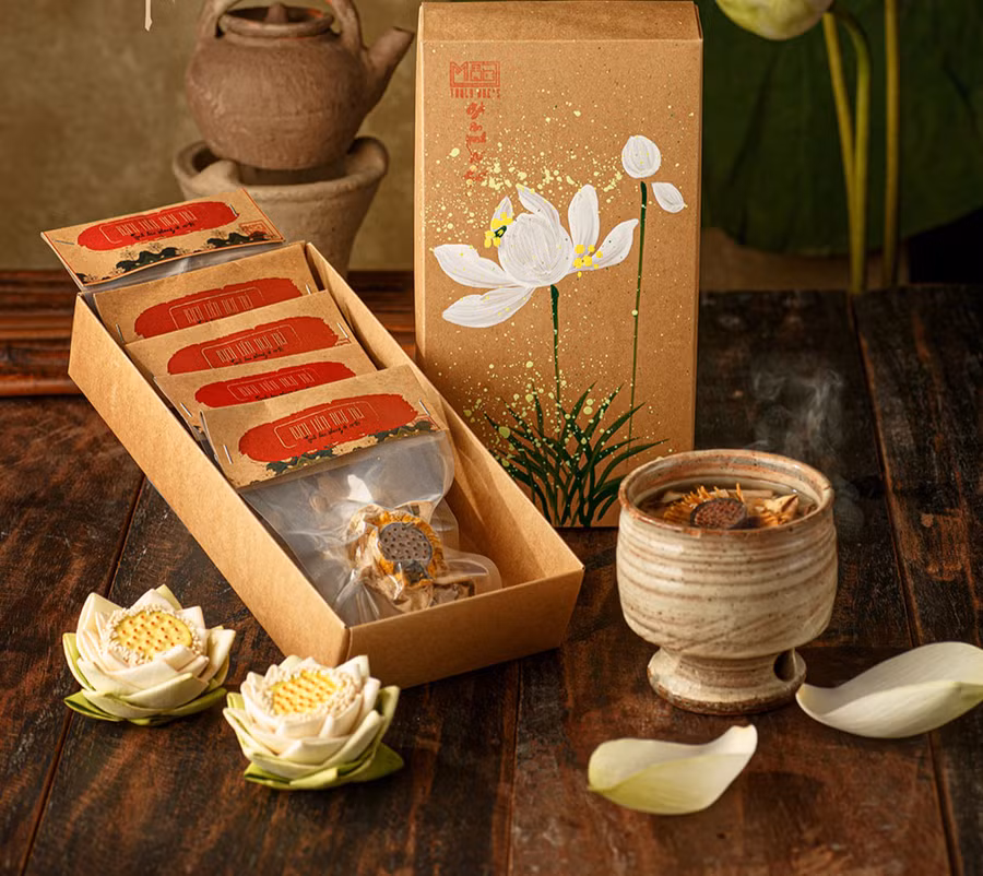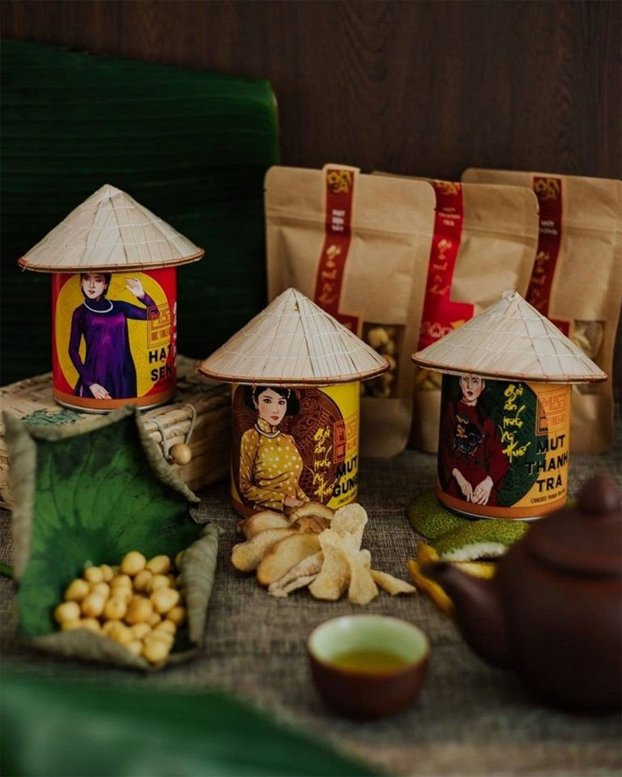 | Một số sản phẩm ấn tượng của Mộc Truly Hue’s: trà sen, hạt sen, bánh pháp lam, mè xửng, mứt gừng sấy dẻo. NVCC |