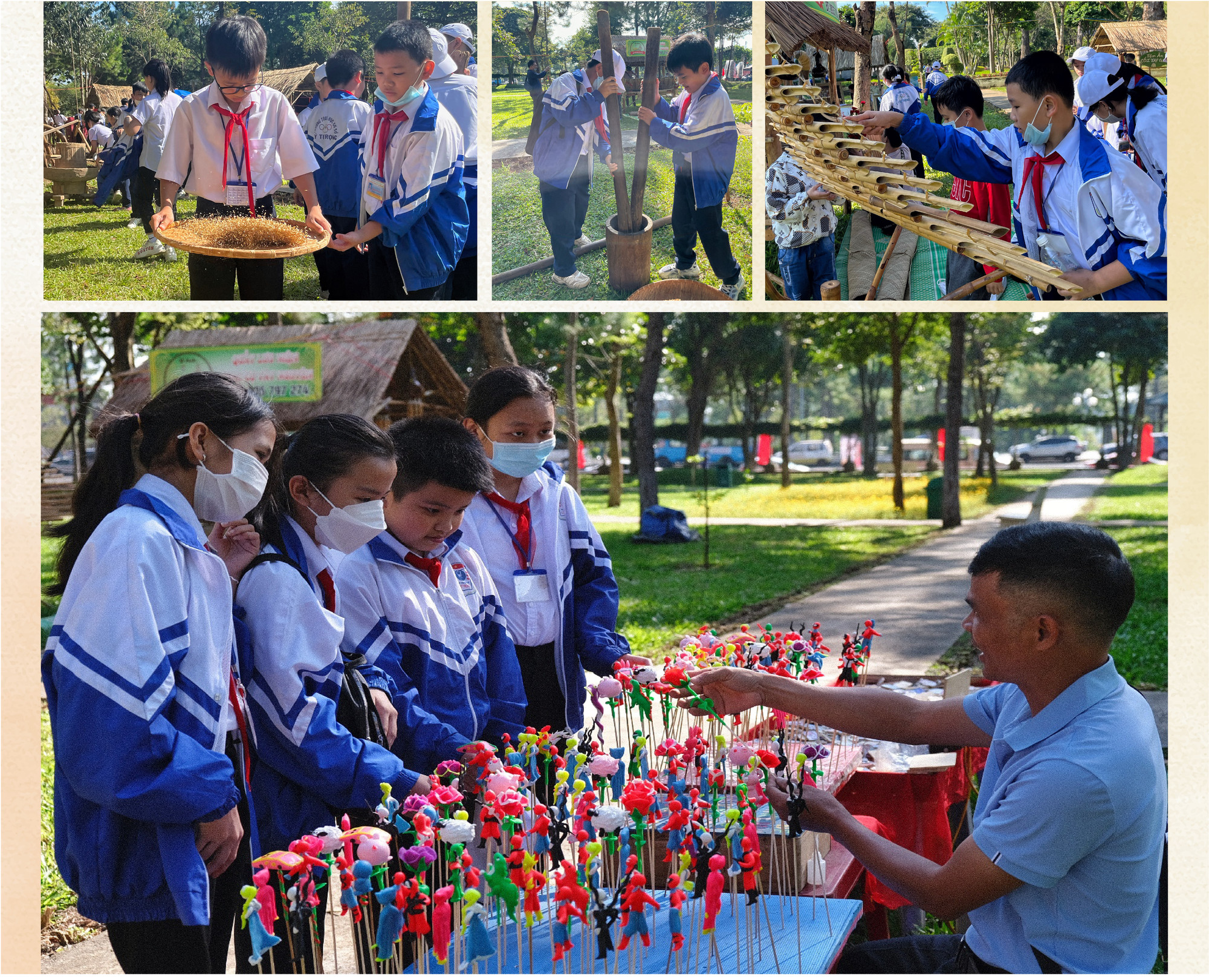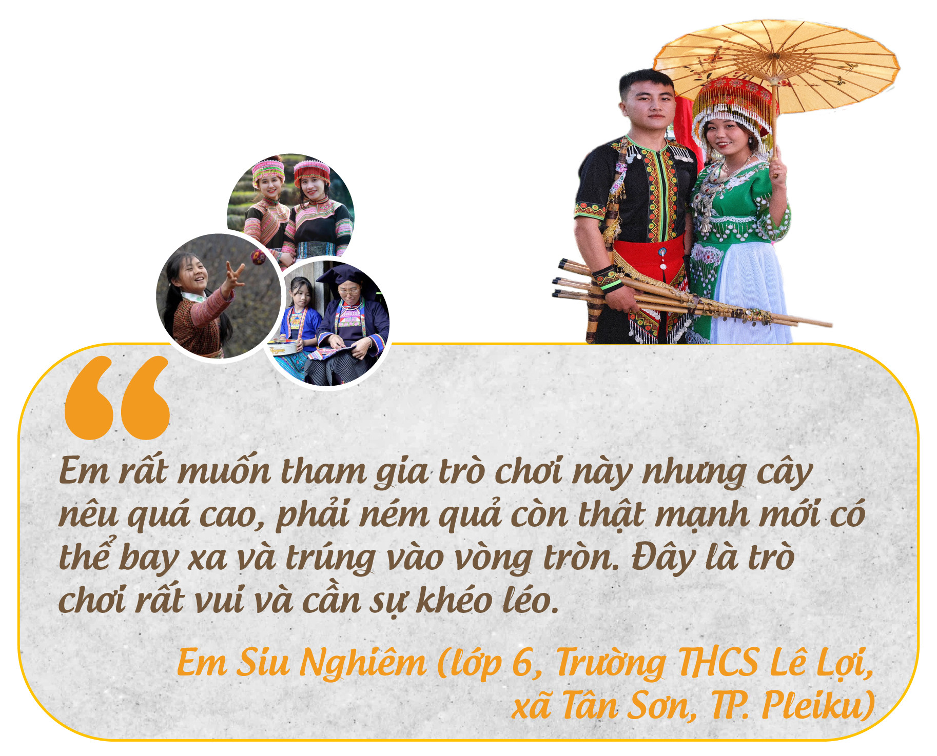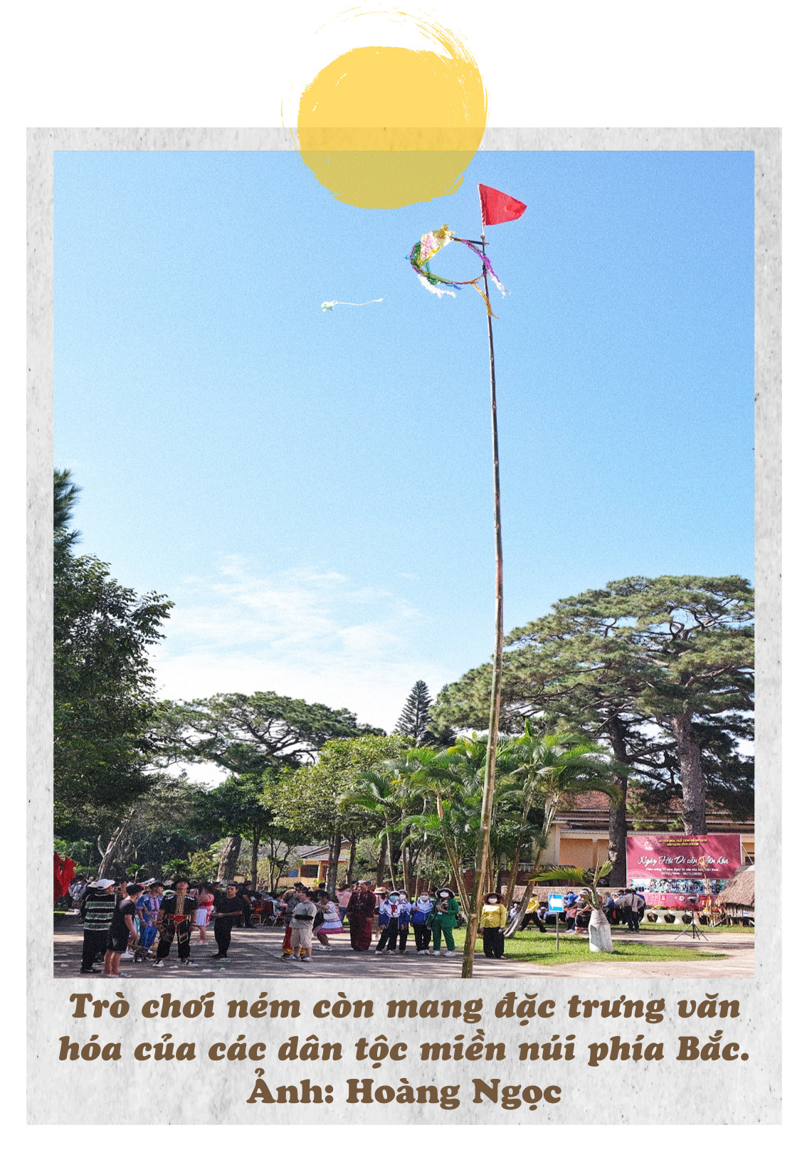 Không chỉ mãn nhãn với màu sắc văn hóa từ trang phục, những trò chơi dân gian của cư dân bản địa Tây Nguyên và vùng Tây Bắc tạo không khí sôi động cho ngày hội. Em Siu Nghiêm (lớp 6, Trường THCS Lê Lợi, xã Tân Sơn, TP. Pleiku) không rời mắt khỏi những quả còn lao vun vút về phía vòng tròn sặc sỡ gắn trên đỉnh cây nêu cao chót vót.