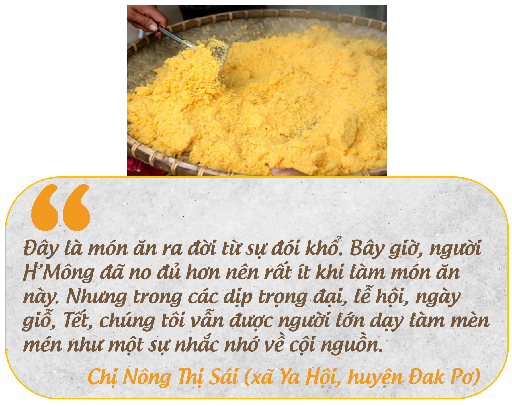 Thuộc thế hệ thứ 3 của người H’Mông sinh sống ở vùng đất Ya Hội, chị Nông Thị Sái vừa phục vụ mèn mén cho thực khách, vừa giới thiệu lịch sử của món ăn. Với chị Sái, món ăn chính là sự kết nối của các thế hệ. “ Đây là món ăn ra đời từ sự đói khổ. Bây giờ, người H’Mông đã no đủ hơn nên rất ít khi làm món ăn này. Nhưng trong các dịp trọng đại, lễ hội, ngày giỗ, Tết, chúng tôi vẫn được người lớn dạy làm mèn mén như một sự nhắc nhớ về cội nguồn”-chị Sái cho hay.
