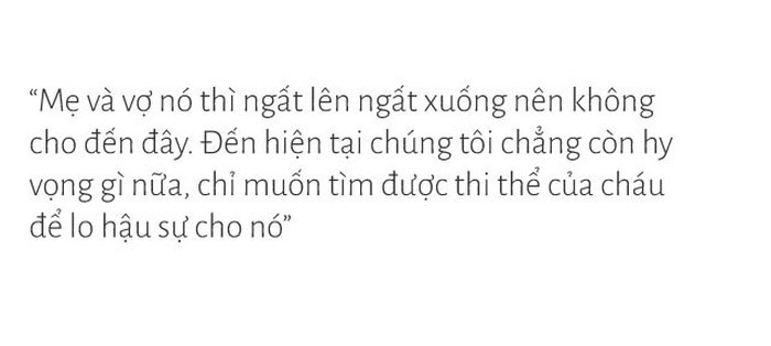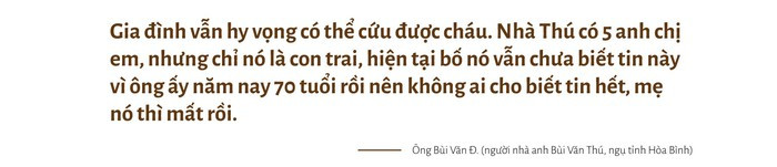 Còn theo ông Bùi Văn Đ. (người nhà anh Bùi Văn Thú, ngụ tỉnh Hòa Bình), gia đình hay tin là vội vàng tới ngay hiện trường và đã vào bên trong hang. "Khi vào sâu được khoảng 150 m thì không thể đi được nữa do bùn ngập sâu. Gia đình vẫn hy vọng có thể cứu được cháu. Nhà Thú có 5 anh chị em, chỉ nó là con trai, hiện bố nó vẫn chưa biết tin này vì ông ấy năm nay đã 70 tuổi, sợ biết tin sẽ ngã quỵ. Còn mẹ nó thì mất rồi. Gia đình có biết cháu đi làm vàng, nhưng không biết cháu chui vào trong hang sâu"- ông Đ. nấc nghẹn.