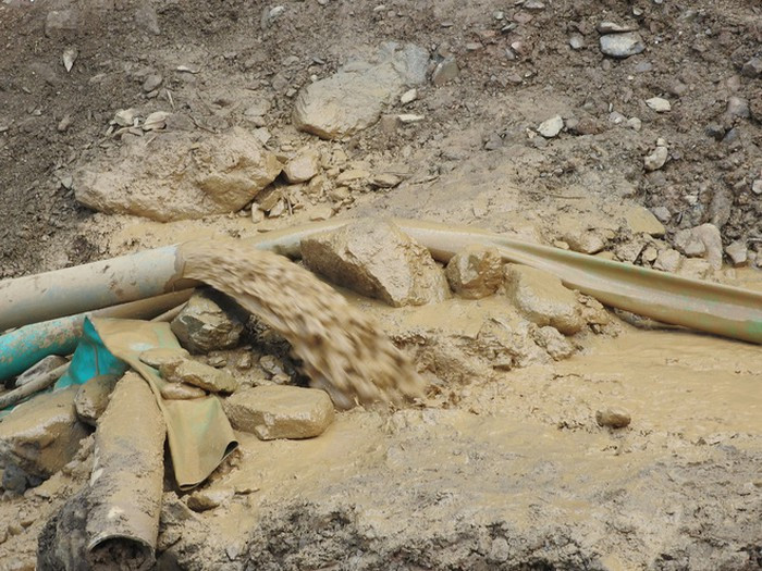 Để hút được bùn thì phải có khoảng 6 -7 người cầm vòi nước xả liên tục, nếu không bùn cạn đóng thành tảng không thể hút ra. Ngoài máy bơm, hai máy xúc được tăng cường vào trong hang cào bùn ra.
