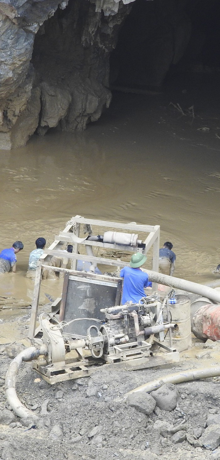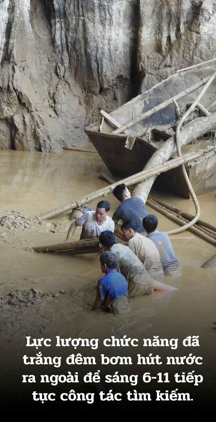 Lực lượng cứu hộ cứu nạn tỉnh Hòa Bình vẫn đang nỗ lực đưa nước, bùn đất trong hang Cột Cờra ngoài để dò tìm vị trí 2 phu vàng đang mắc kẹt trong hang từ tối 4-11.