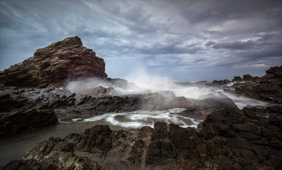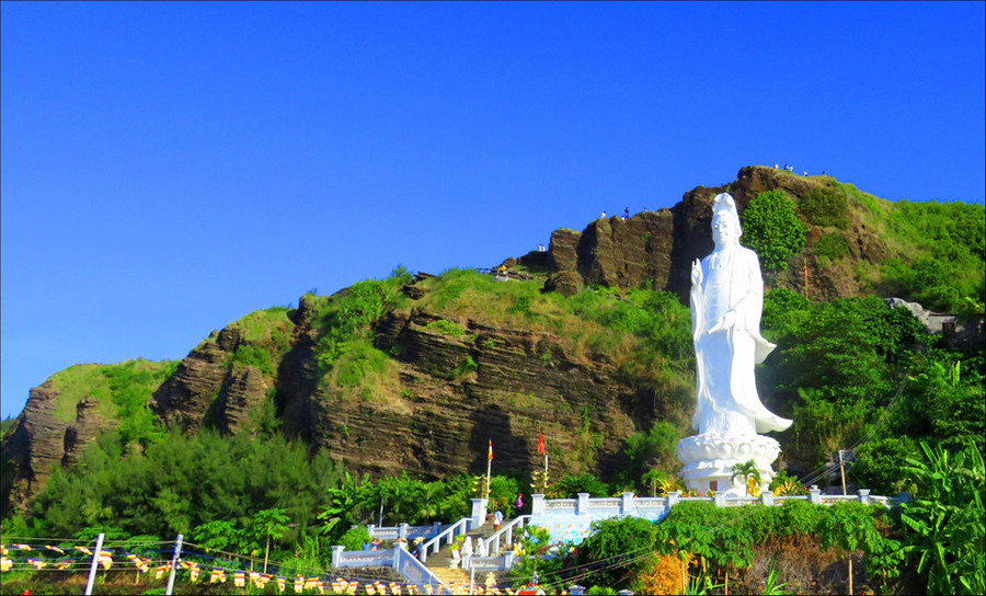 Nối liền giữa dãy núi đá hùng vĩ và bờ biển là bức tượng Quan Âm in trên nền trời cao xanh lồng lộng. Bức tượng là một phần trong quần thể kiến trúc chùa Hang. Người xưa đã tận dụng hang động nằm sâu trong lòng núi, sát bên bờ biển, để xây dựng nên ngôi chùa hòa hợp với cảnh thiên nhiên.