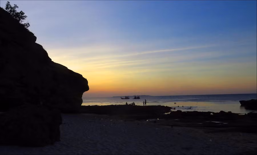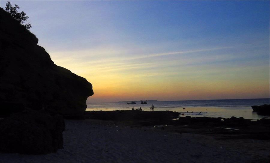 Nhìn từ Chùa Hang, hoàng hôn buông xuống, từ từ loang ra mặt biển, tạo nên khung cảnh thơ mộng, bình yên nơi đảo xa.