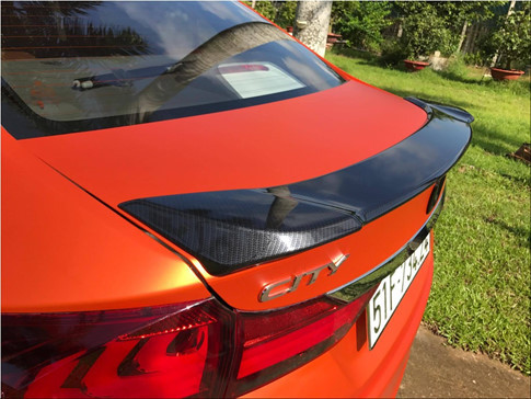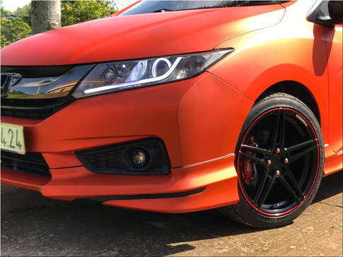 Chiếc Honda City này được trang bị bộ mâm đúc kích thước lớn 17 inch 5 cánh kép sơn đen, thay cho loại 16 inch của xe nguyên bản. Tiếp đó, bộ bodykit thể thao góp phần giúp kiểu dáng Honda City trẻ trung hơn với các tấm ốp lườn đầu, đuôi và thân xe, tạo cảm giác xe có trọng tâm thấp hơn.
