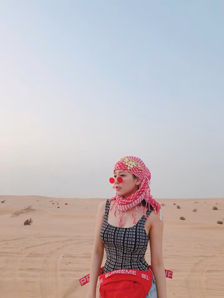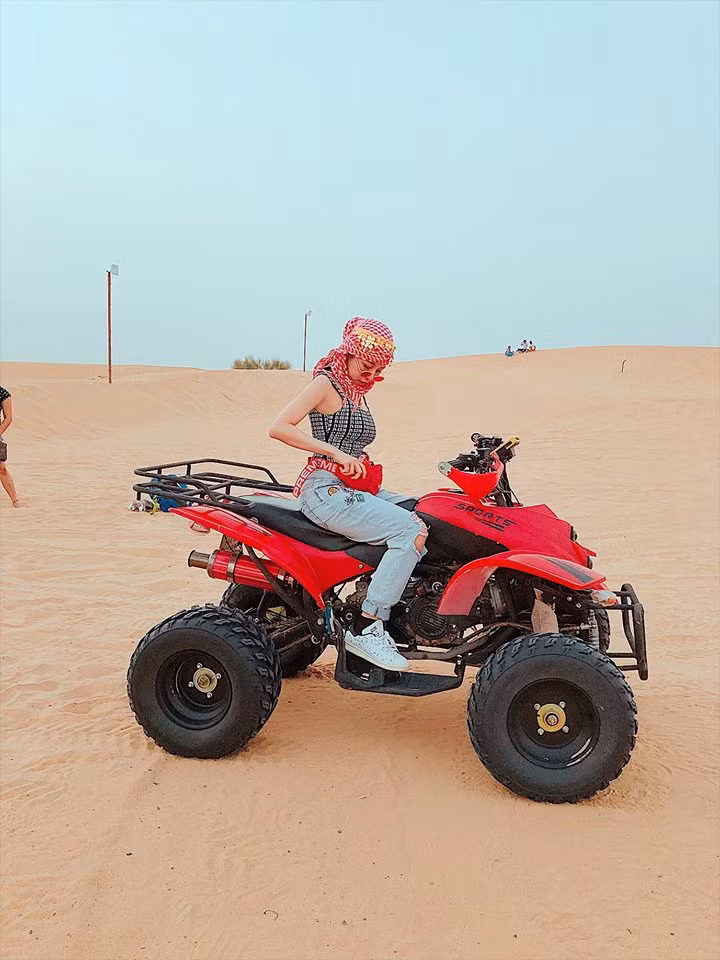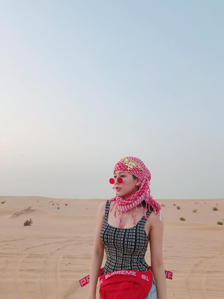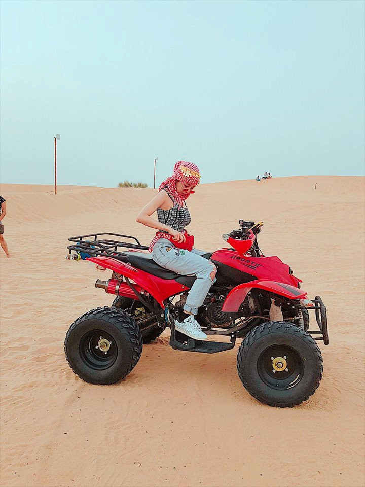 Trâm Anh cũng không bỏ qua chuyến du ngoạn đến sa mạc Safari. Safari là một phần của sa mạc Arab, gắn liền với tên tuổi “con đường tơ lụa” của các nhà buôn Trung Quốc. Chia sẻ về trải nghiệm đáng nhớ nhất ở Dubai, hot girl cho biết: "Mỗi ngày ở Dubai đều có rất nhiều kỷ niệm đáng nhớ nhưng mình ấn tượng nhất là khi được lái xe trên cát. Bề mặt cát không phẳng và bị lún khiến mình hơi sợ. Tuy nhiên khi đi quen rồi thì rất thích. Bạn nào muốn trải nghiệm cảm giác mạnh thì chắc chắn nên chơi trò này".