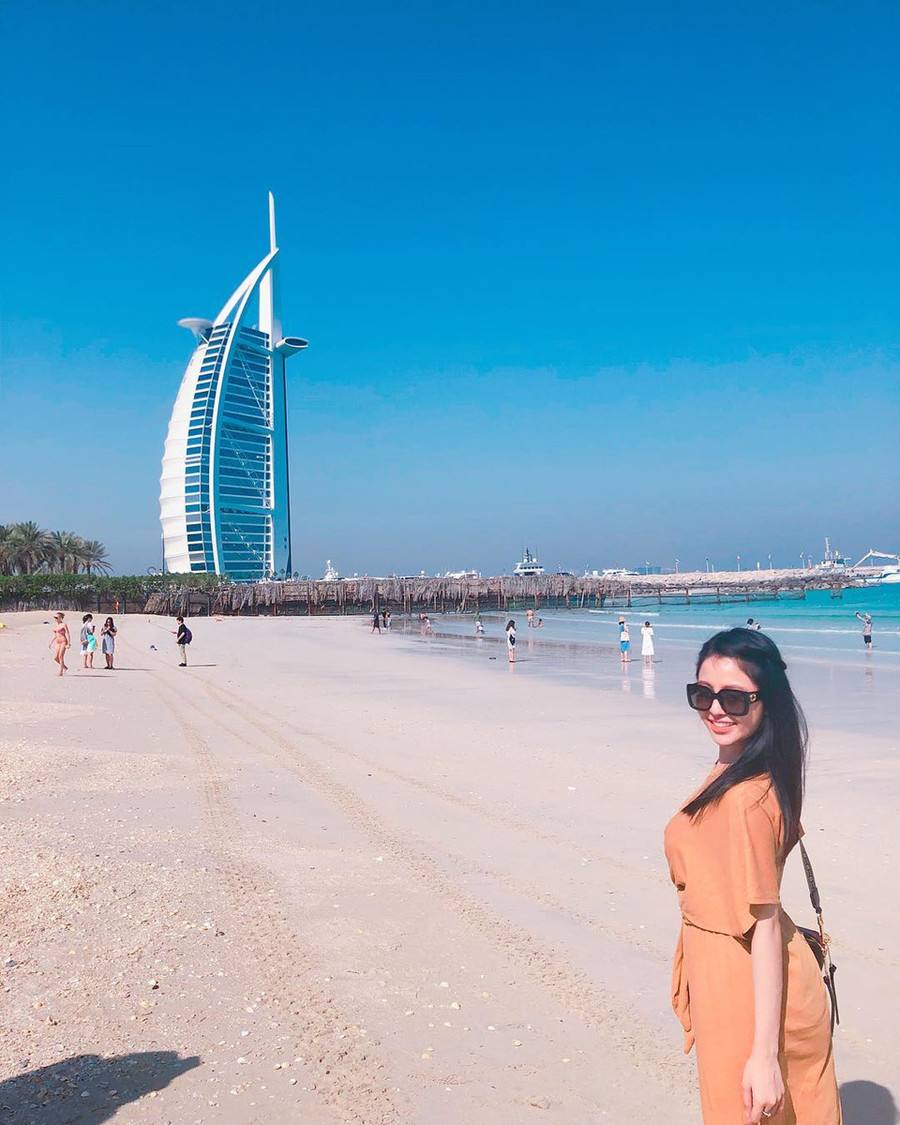 Điểm đầu tiên Trâm Anh check-in khi đặt chân đến Dubai là tòa nhà Burj Al Arab. Được mệnh danh như biểu tượng của Dubai với hình cánh buồm khổng lồ, Burj Al Arab là một khách sạn bảy sao với độ cao 321 m. Đây cũng là tòa nhà nằm trong top 4 những khách sạn cao nhất thế giới.