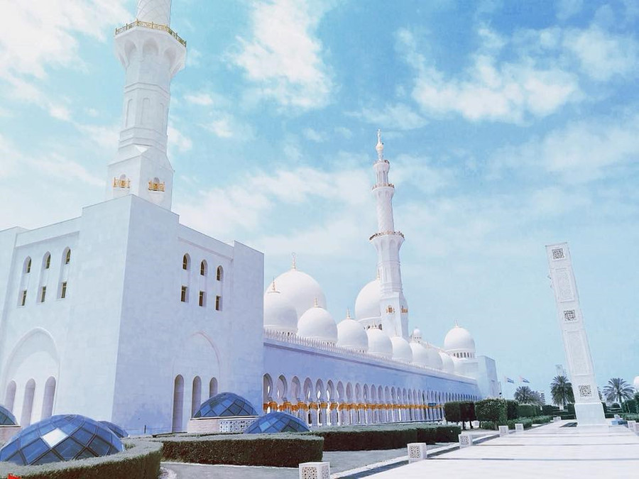 Thánh đường Sheikh Zayed thu hút Trâm Anh bởi màu trắng muốt của đá cẩm thạch. Công trình tượng trưng cho nền văn hóa Dubai khánh thành năm 2007 với tổng chi phí gần 600 triệu USD gồm 82 mái vòm và 4 ngọn tháp cao 107 m. Đây cũng là địa điểm gây được ấn tượng mạnh với hot girl bởi kiến trúc độc đáo, đẹp và tráng lệ.
