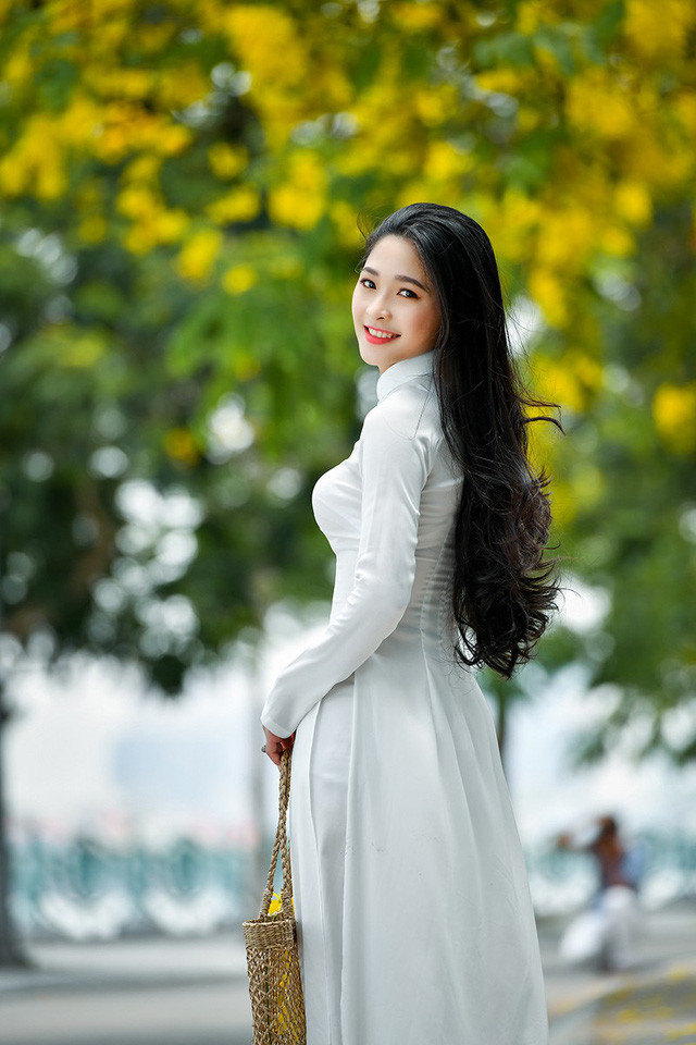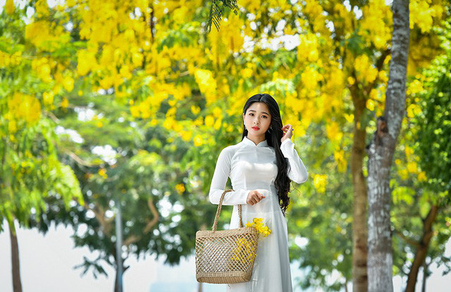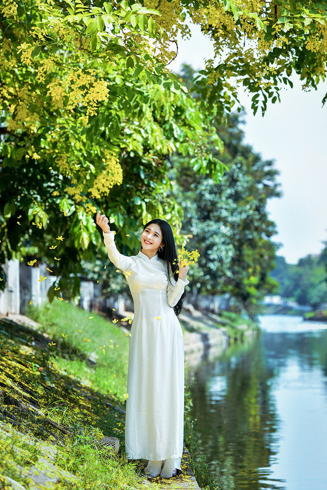 | Vẻ đẹp của cô gái xứ Nghệ như tỏa sáng rực rỡ hơn dưới sắc vàng của hoa hoàng yến. |