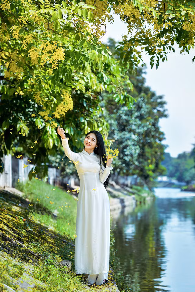 Hoa muồng hoàng yến nở rộ nhuộm vàng con đường ven hồ Tây của Hà Nội cuốn hút cô gái xứ Nghệ có nick-name là "hot girl tráng bánh mướt" Nguyễn Hoàng Kim Khánh.