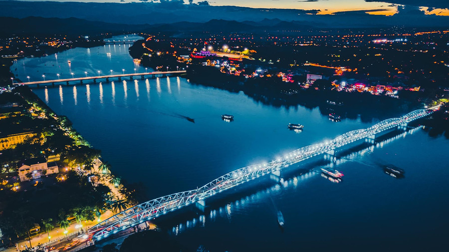 Vào những đêm cuối tuần, ta bắt gặp cầu Tràng Tiền nổi bật và rực rỡ trong bộ cánh lấp lánh đủ sắc màu với muôn nghìn ánh điện lung linh đổi màu liên tục. Duyên dáng soi bóng trên dòng sông Hương thơ mộng, cây cầu có niên đại hơn 100 năm với kiến trúc độc đáo đã chứng kiến bao biến cố thăng trầm lịch sử xứ Huế.