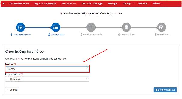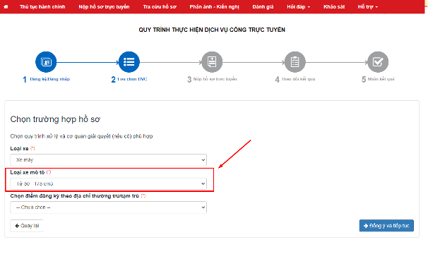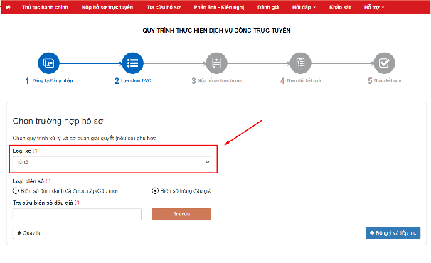 Công dân thực hiện lựa chọn loại xe muốn thực hiện kê khai dịch vụ công trực tuyến toàn trình.