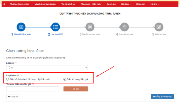 Tra cứu biển số trúng đấu giá: Đối với trường hợp đăng ký cấp biển số mới là biển số trúng đấu giá, công dân thực hiện nhập biển số trúng đấu giá và tra cứu.