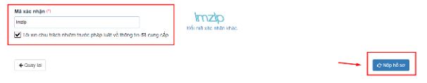 | Công dân bấm [Đồng ý và tiếp tục], nhập mã xác nhận để nộp hồ sơ. |