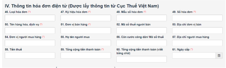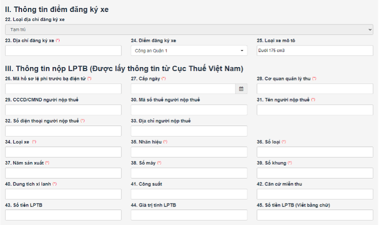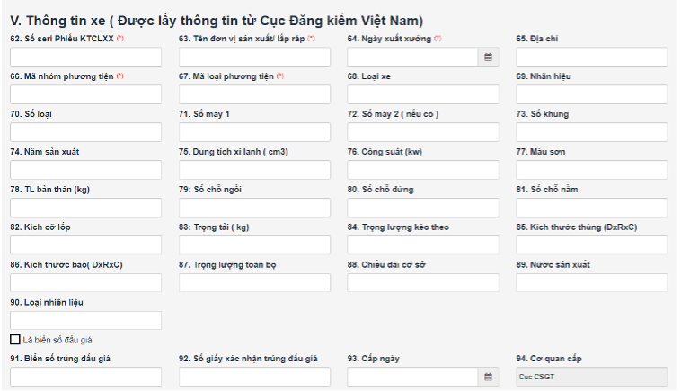 Sau khi hệ thống hoàn thành kiểm tra dữ liệu xe, nếu xe đủ điều kiện nộp hồ sơ công dân tiến tra thông tin tờ khai và nhập hoàn thiện các thông tin còn thiếu nếu có.