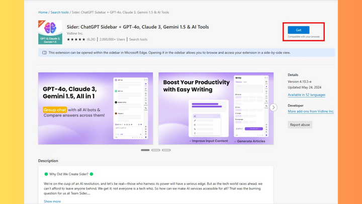 Bước 1: Để sử dụng miễn phí ChatGPT 4 Turbo và Gemini miễn phí trên máy tính, bạn cần tải về một công cụ có tên là Sider. Đây là một tiện ích mở rộng có trên Microsoft Edge, bạn có thể tìm kiếm thủ công trên Google.