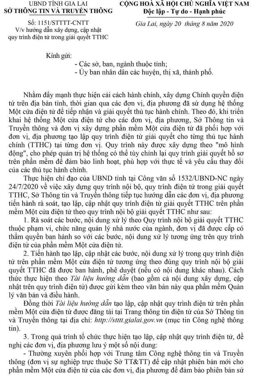 (GLO)- Sở Thông tin Truyền thông tỉnh Gia Lai vừa có Công văn số 1151-STTTT-CNTT về việc hướng dẫn xây dựng, cập nhật quy trình điện tử trong giải quyết thủ tục hành chính.