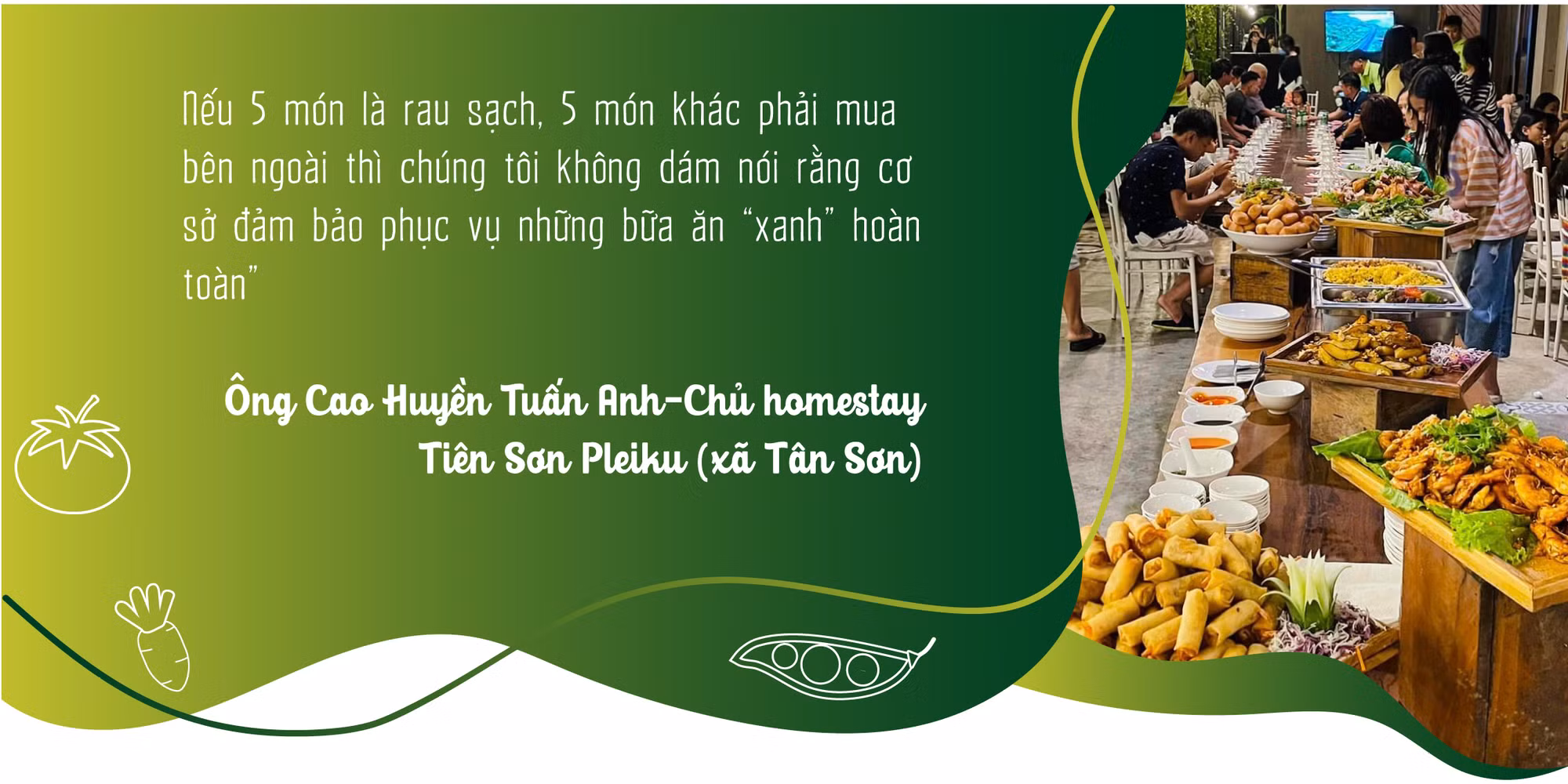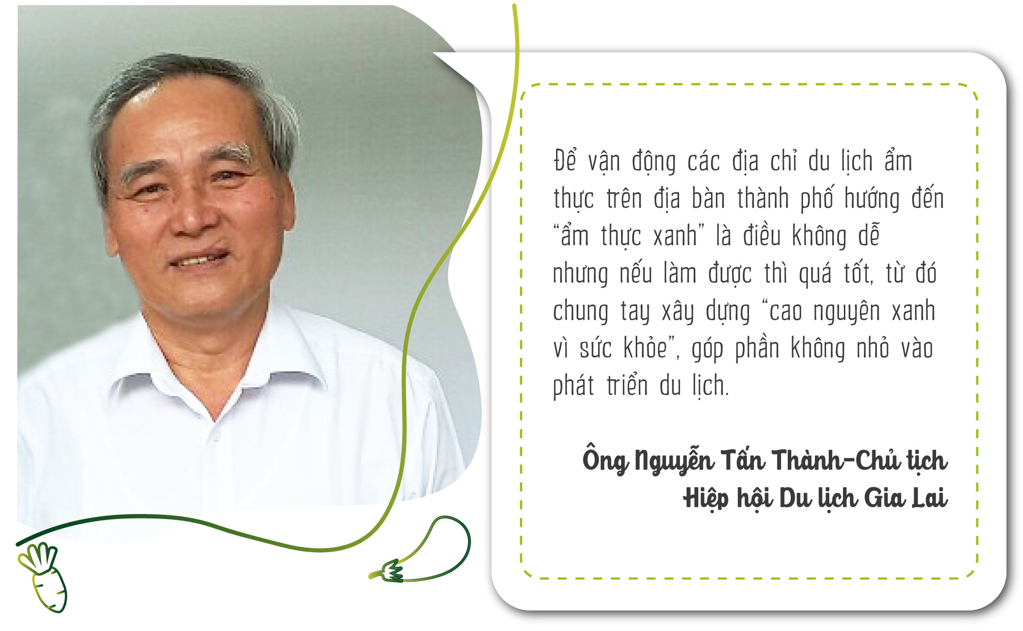 Nêu quan điểm về việc vận động các địa chỉ du lịch ẩm thực tiên phong cung ứng những bữa ăn “xanh” đến du khách, Chủ homestay Tiên Sơn Pleiku khẳng định: “Tôi hoàn toàn ủng hộ vì đây là vấn đề rất hay, rất đáng quan tâm, phù hợp với mục tiêu xây dựng thành phố “Cao nguyên xanh vì sức khỏe”. Tuy nhiên, để làm được điều này thì trước tiên cần đảm bảo chuỗi cung ứng tại địa phương, đa dạng sản phẩm để các cơ sở không quá vất vả trong khâu thu mua nguyên liệu. Ngoài ra, cần có sự kiểm định thường xuyên, chặt chẽ, đảm bảo độ tin cậy về chất lượng các sản phẩm này”.