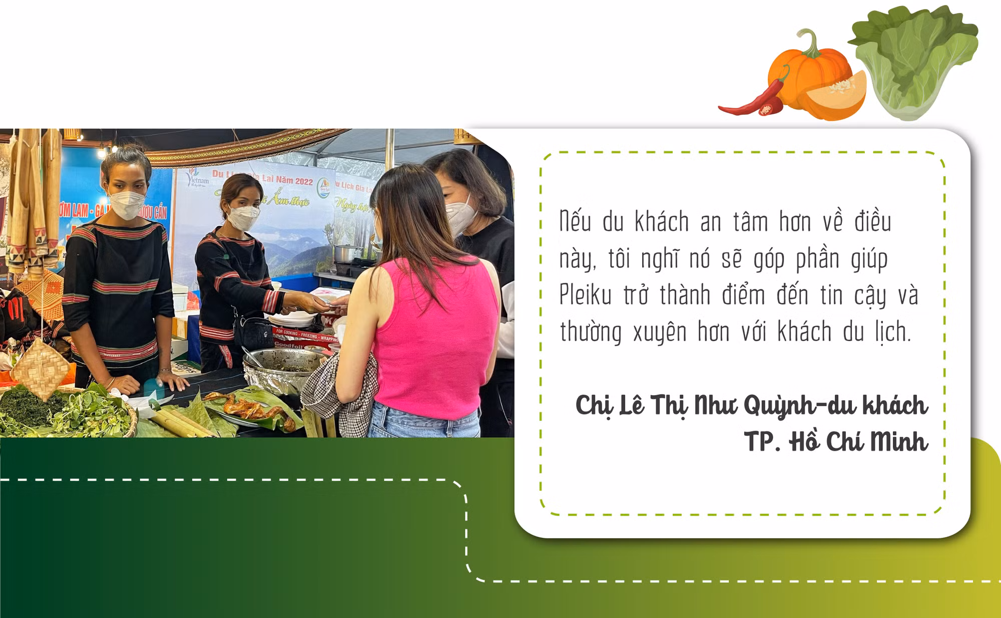 Đã nhiều lần đến với Pleiku, chị Lê Thị Như Quỳnh-du khách TP. Hồ Chí Minh-nhận xét: “Tôi dành nhiều tình cảm với thành phố này không chỉ bởi nơi đây có nhiều cây xanh, không khí trong lành, nhiều điểm đến gần gũi với thiên nhiên mà còn vì có các món ăn địa phương rất ngon. Tôi nghĩ ẩm thực là một tiêu chí quan trọng khi bạn quyết định chọn đến một nơi du lịch, cũng là thứ dễ gợi nhớ đến vùng đất ấy cho bất cứ ai từng đến”. Bên cạnh đó, chị Quỳnh cũng bày tỏ: Tuy khá hài lòng vì được thưởng thức nhiều món ngon của địa phương song chị vẫn băn khoăn về mức độ an toàn thực phẩm trong chế biến cũng như nguyên liệu đầu vào.