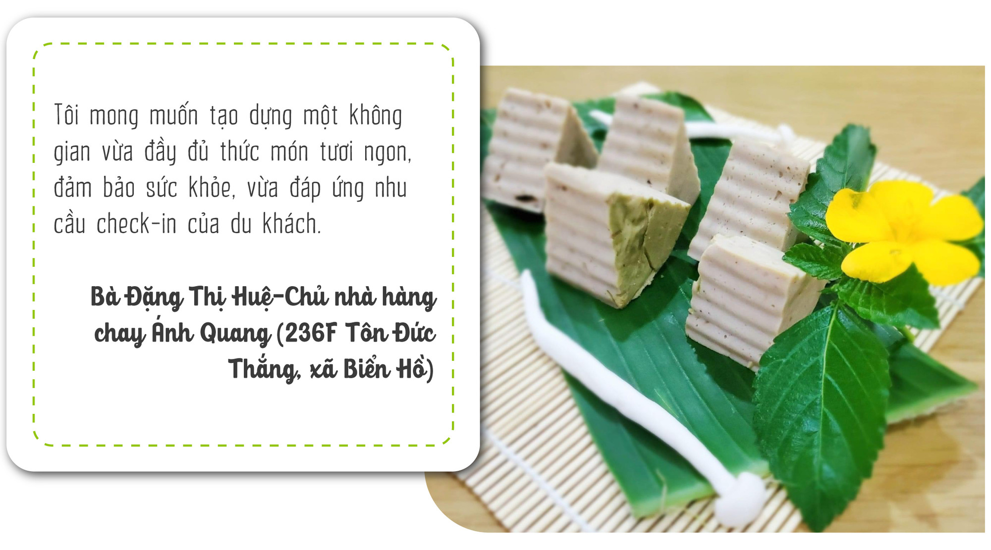 Nằm ở vị trí đắc địa, có view ngắm được toàn cảnh Biển Hồ từ trên cao, lâu nay, nhà hàng chay Ánh Quang (236F Tôn Đức Thắng, xã Biển Hồ) được nhiều du khách xem là điểm đến du lịch ẩm thực. Bà Đặng Thị Huệ-Chủ nhà hàng-cho hay: Sau gần 30 năm ăn chay trường, cơ sở này là tâm huyết của bà với mong muốn quảng bá kênh thực phẩm chay hữu cơ, đồng thời lan tỏa thông điệp bảo vệ môi trường. Có lẽ đây là nhà hàng đầu tiên trên địa bàn TP. Pleiku hướng đến “ẩm thực xanh” ngay từ khi ra mắt.
