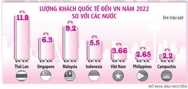 Việt Nam là một trong những quốc gia đầu tiên trong khu vực Đông Nam Á mở cửa trở lại sau đại dịch Covid-19 nhưng lại có tỷ lệ phục hồi ngành du lịch thấp nhất so với các nước trong khu vực. Theo trang VisaGuide.World, tỷ lệ phục hồi du lịch của VN hiện chỉ đạt 18,1%, trong khi các nước trong khu vực như Thái Lan, Singapore, Malaysia hay Campuchia đều đạt tỷ lệ từ 26 - 31%. Trong năm 2022, du khách nước ngoài đến VN chỉ đạt được xấp xỉ 3,5 triệu - thấp hơn nhiều so với chỉ tiêu mà ngành du lịch đặt ra là 5 triệu khách quốc tế.