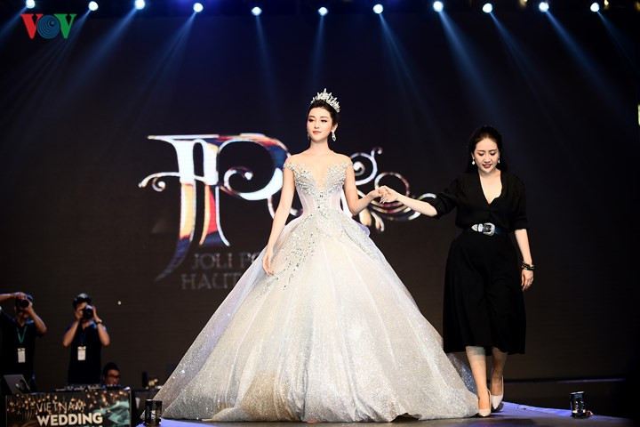 | Người đẹp diện bộ váy cưới ánh kim lộng lẫy, tự tin trình diễn trên sân khấu. |