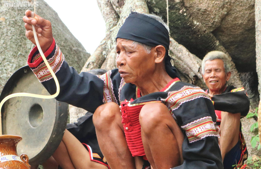 | Ông Rơ Lan Hieo - phụ tá vua lửa thứ 14 thực hiện nghi lễ cúng cầu mưa. |