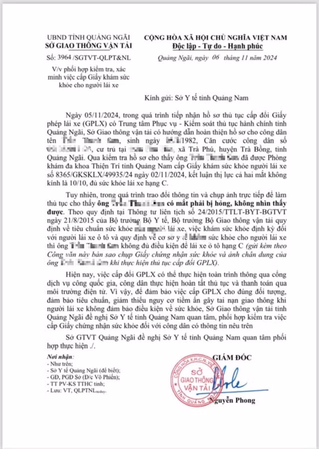 Để đảm bảo việc cấp GPLX đúng đối tượng, đảm bảo tiêu chuẩn, giảm thiểu nguy cơ tiềm ẩn gây tai nạn giao thông khi người lái xe không đảm bảo điều kiện về sức khỏe, Sở Giao thông vận tải tỉnh Quảng Ngãi đề nghị Sở Y tế tỉnh Quảng Nam quan tâm, phối hợp kiểm tra việc cấp giấy chứng nhận sức khỏe đối với công dân có thông tin nêu trên.