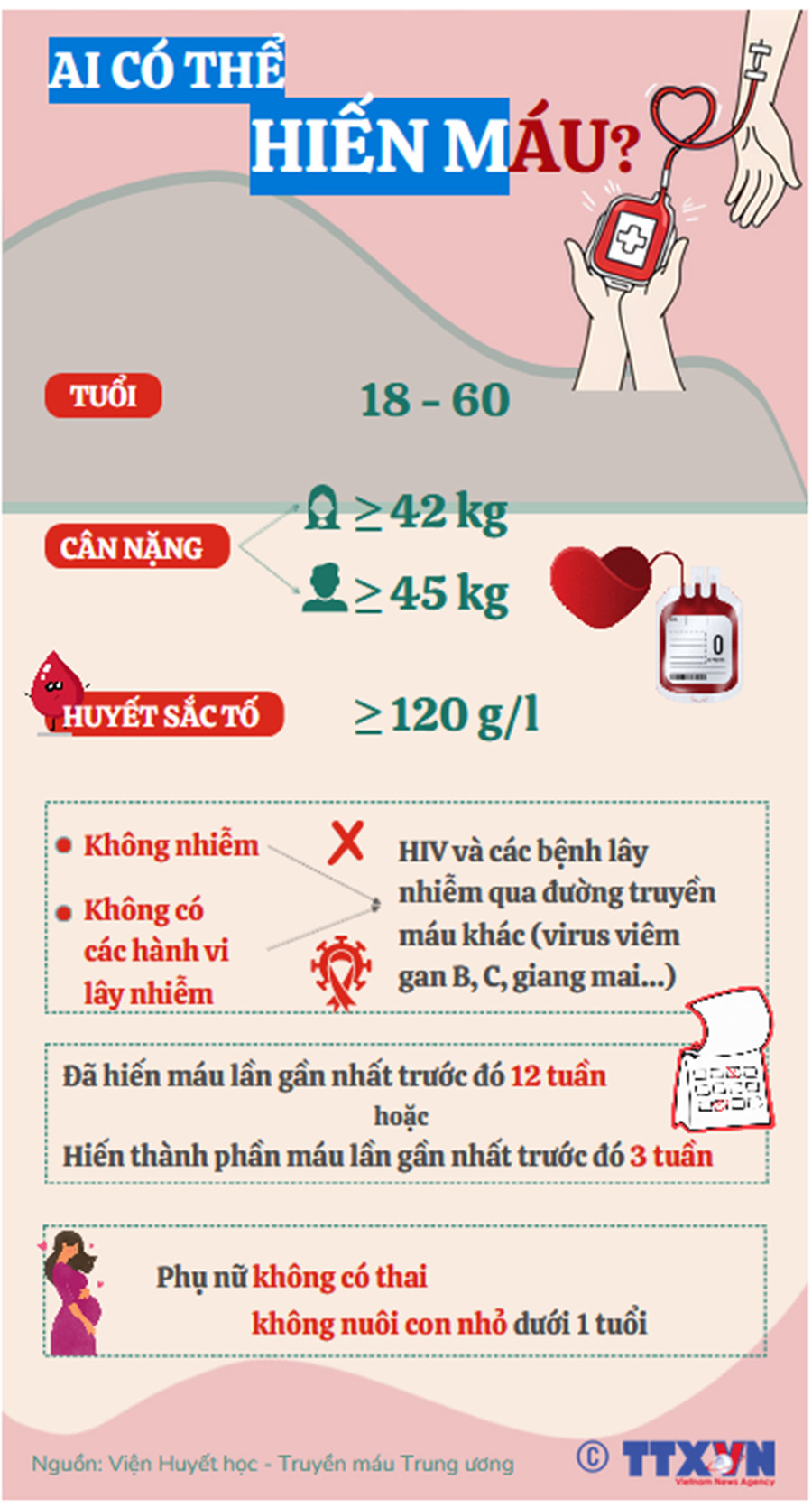 Để có thể hiến máu cần các tiêu chuẩn như tiêu chuẩn về tuổi, cân nặng, huyết sắc tố của người hiến máu.
