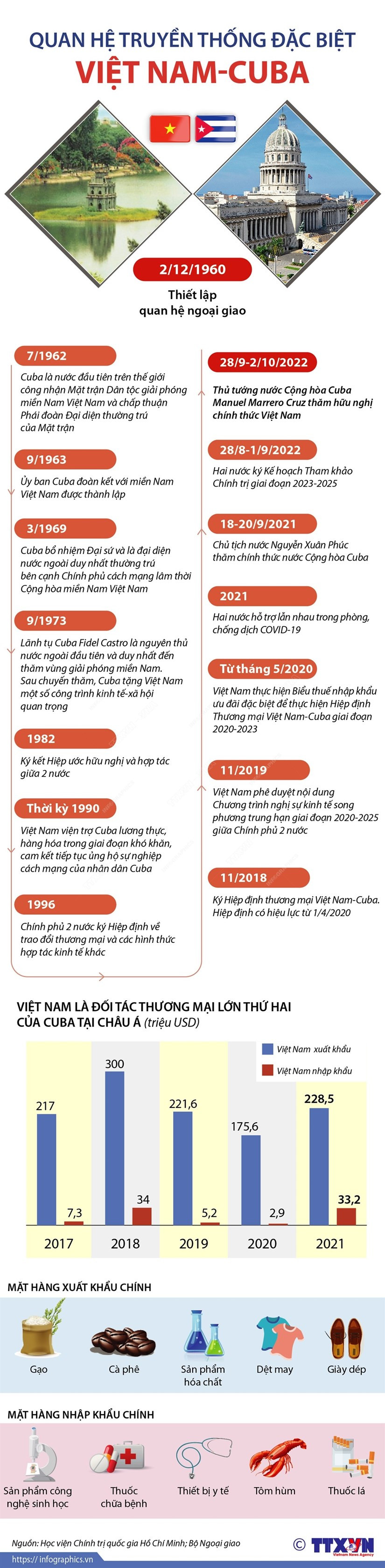 Nhận lời mời của Thủ tướng Chính phủ Phạm Minh Chính, Thủ tướng nước Cộng hòa Cuba Manuel Marrero Cruz thăm hữu nghị chính thức Việt Nam từ ngày 28/9-2/10/2022.