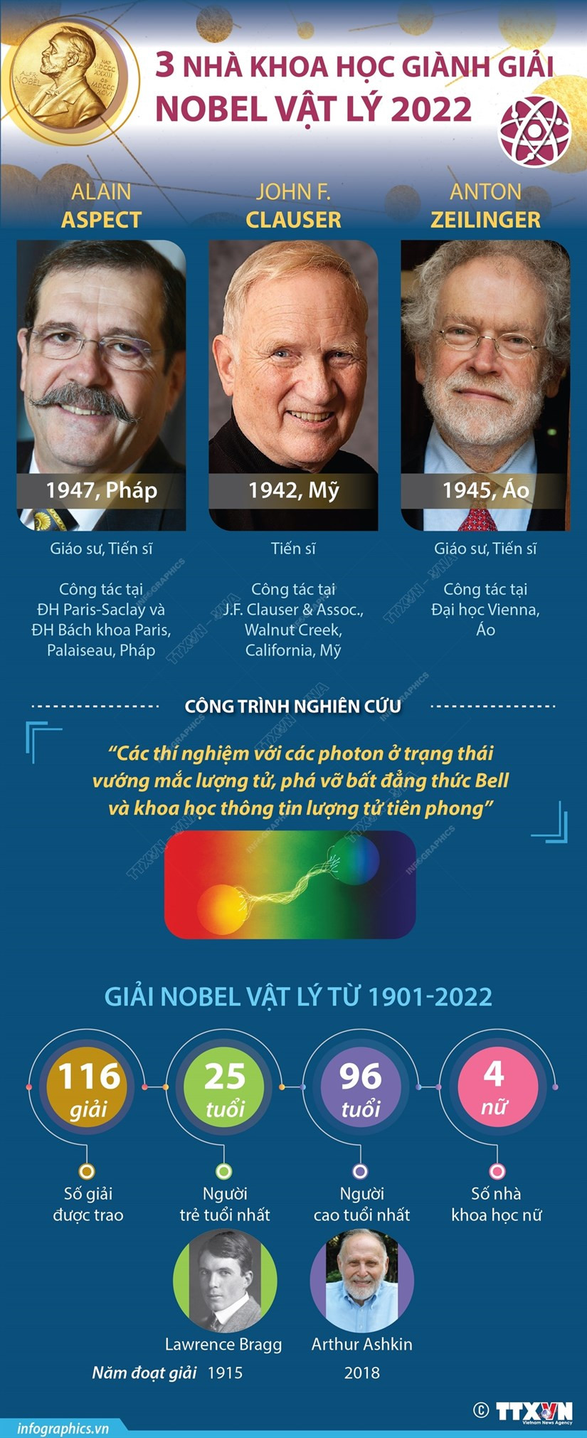 Ba nhà khoa học của Pháp, Mỹ và Áo đã nhận Giải Nobel Vật lý về “các thí nghiệm với các photon ở trạng thái vướng mắc lượng tử, phá vỡ bất đẳng thức Bell và khoa học thông tin lượng tử tiên phong.”