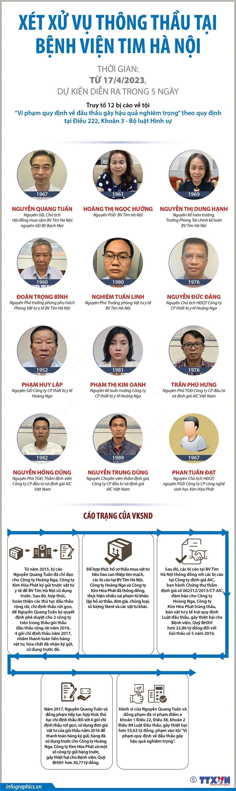 Ngày 17/4, Tòa án Nhân dân thành phố Hà Nội mở phiên tòa xét xử sơ thẩm nguyên Giám đốc Bệnh viện Tim Hà Nội Nguyễn Quang Tuấn và 11 đồng phạm về những sai phạm trong đấu thầu, gây thiệt hại hơn 53,63 tỷ đồng cho Nhà nước.