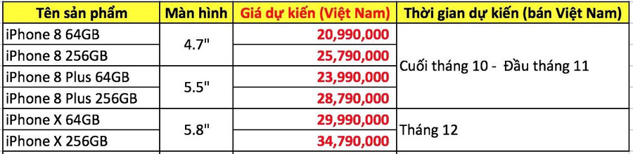 Theo thông tin từ hệ thống bán lẻ FPT Shop, thì loạt sản phẩm iPhone 8, iPhone 8 Plus sẽ chính thức bán ra tại Việt Nam từ ngày cuối tháng 10 với giá bán từ 20,99 triệu đồng. Trong khi đó, phiên bản iPhone X sẽ được bán vào tháng 12 với giá khởi điểm gần 30 triệu đồng.