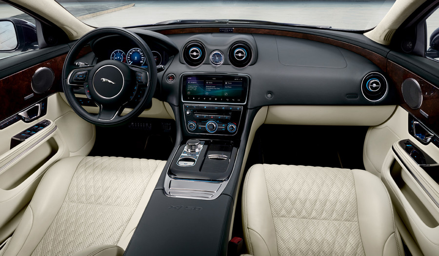 Bên trong, XJ50 sử dụng ghế bọc da mềm nổi bật họa tiết kim cương, tựa đầu dập nổi hình logo chú báo, logo XJ50 được in trên bệ tỳ tay, bậc cửa kim loại phản quang tạo sự khác biệt cho phiên bản. Ngoài ra, lẫy chuyển số được mạ kim loại sáng đồng bộ với chân ga chân phanh bằng kim loại.