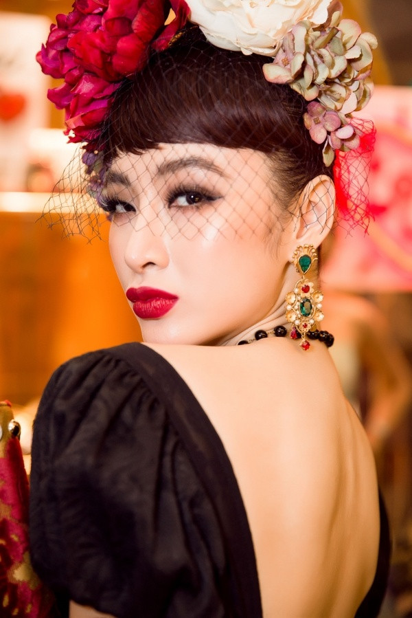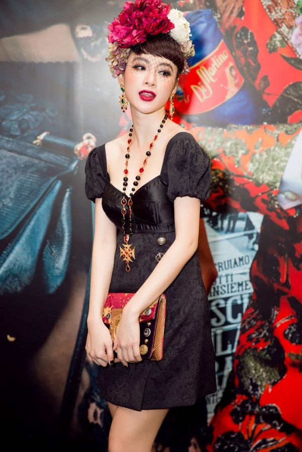 Angela Phương Trinh chọn phong cách cổ tích trong bộ váy ngắn màu đen tay phồng công chúa. Cô đội vòng hoa lớn với khăn che mạng.