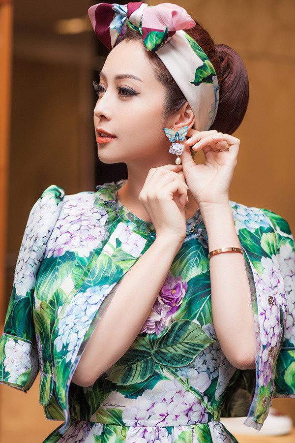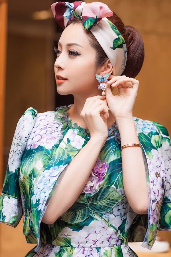 Người đẹp làm duyên khi thắt khăn hình chiếc nơ trên tóc, đeo bông tai hình cánh bướm.