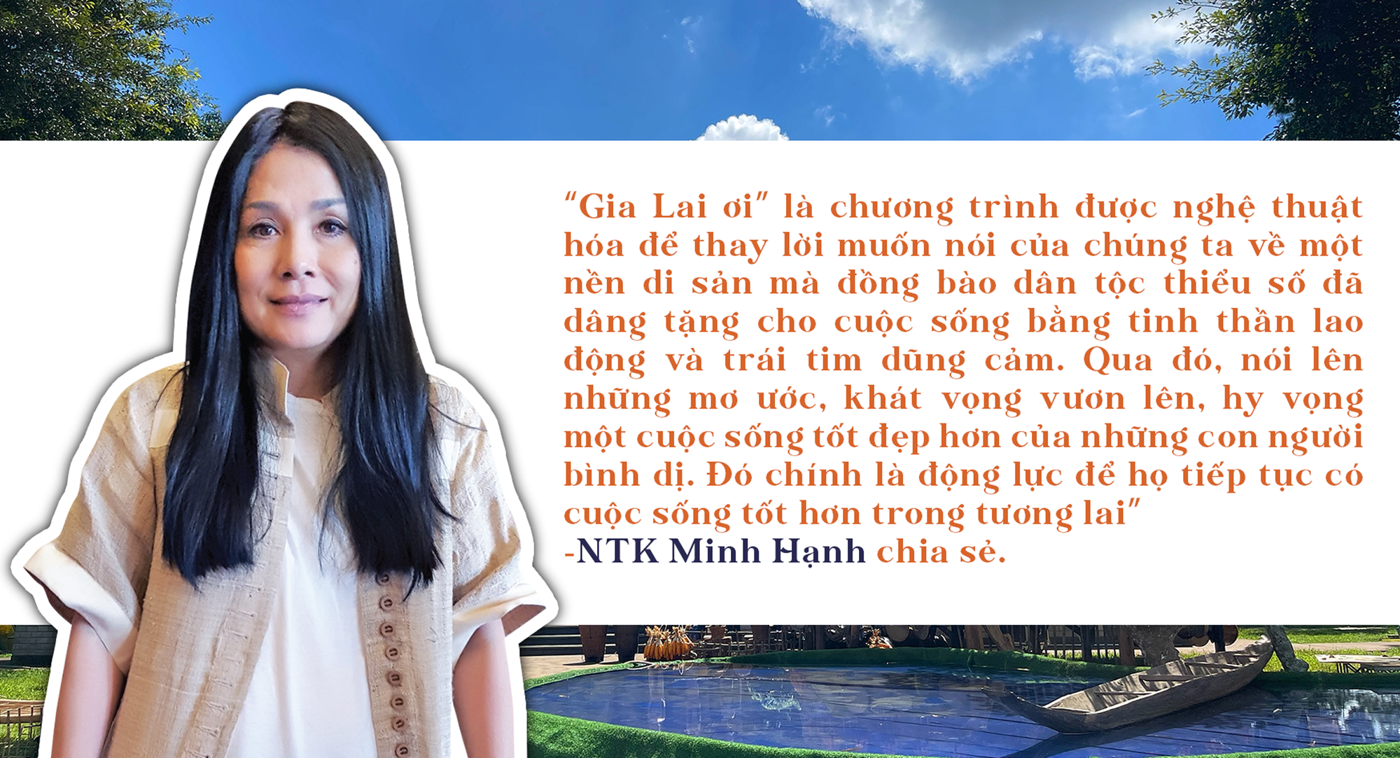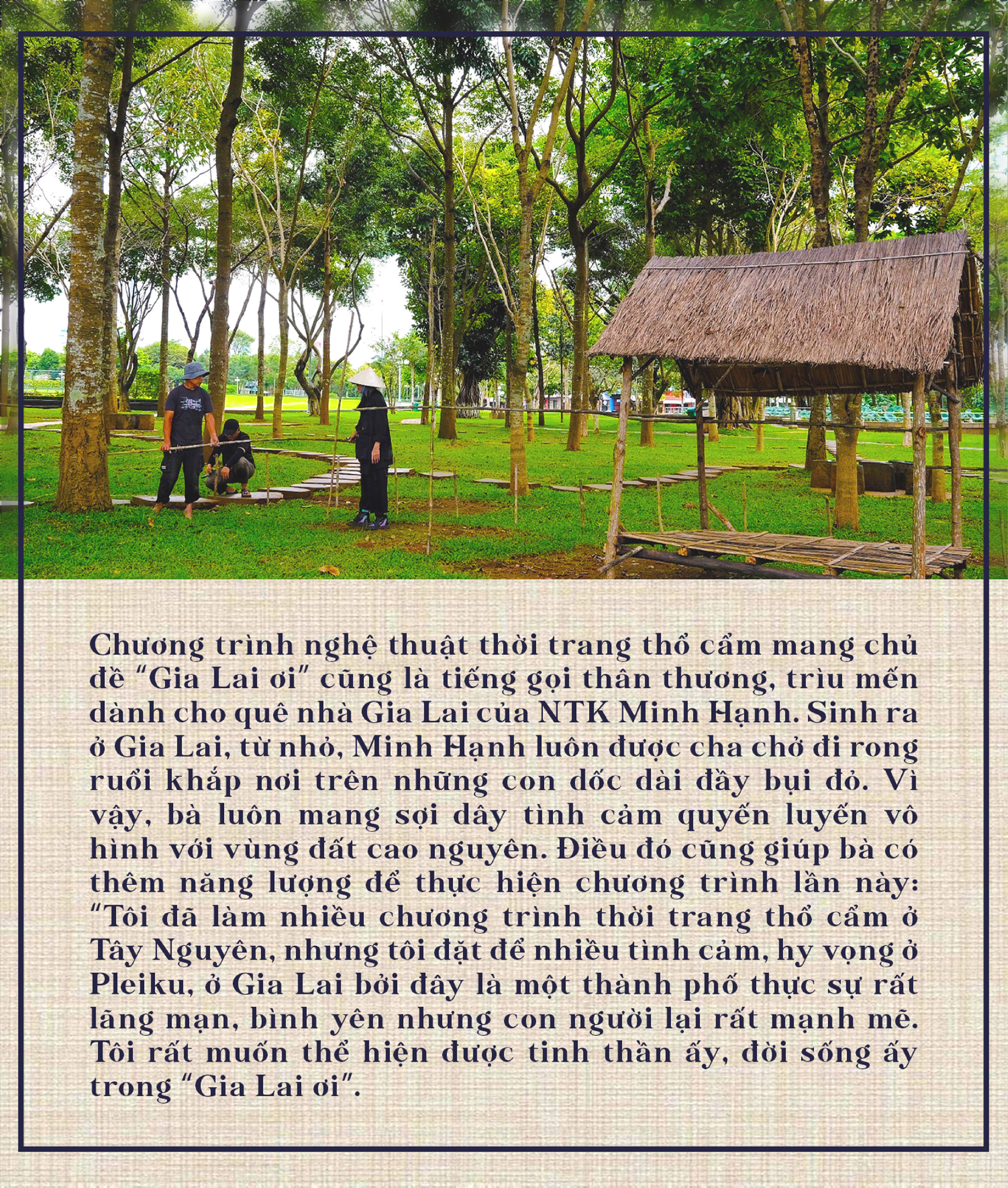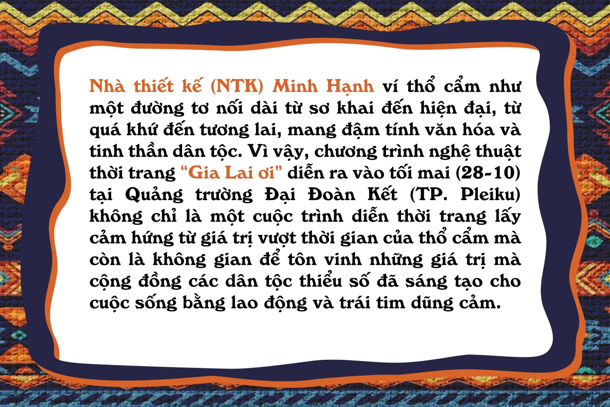 Ngoài đêm trình diễn nghệ thuật thời trang thổ cẩm, chương trình còn có một không gian startup cho các bạn trẻ yêu cà phê, không gian dành riêng cho thổ cẩm với những người dân tộc thiểu số miệt mài bên khung dệt như họ vẫn đang được sống, lao động trong buôn làng mình. Nhà thiết kế Minh Hạnh cho biết, còn nhiều yếu tố bất ngờ chưa được ban tổ chức tiết lộ, song “Gia Lai ơi” sẽ là chương trình thưởng thức nghệ thuật thời trang rất thú vị, khác biệt, trong đó, thời trang chỉ góp phần tái hiện, tôn vinh dòng chảy văn hóa, lịch sử, con người của vùng đất cao nguyên bằng những gì đẹp đẽ, tinh túy nhất.