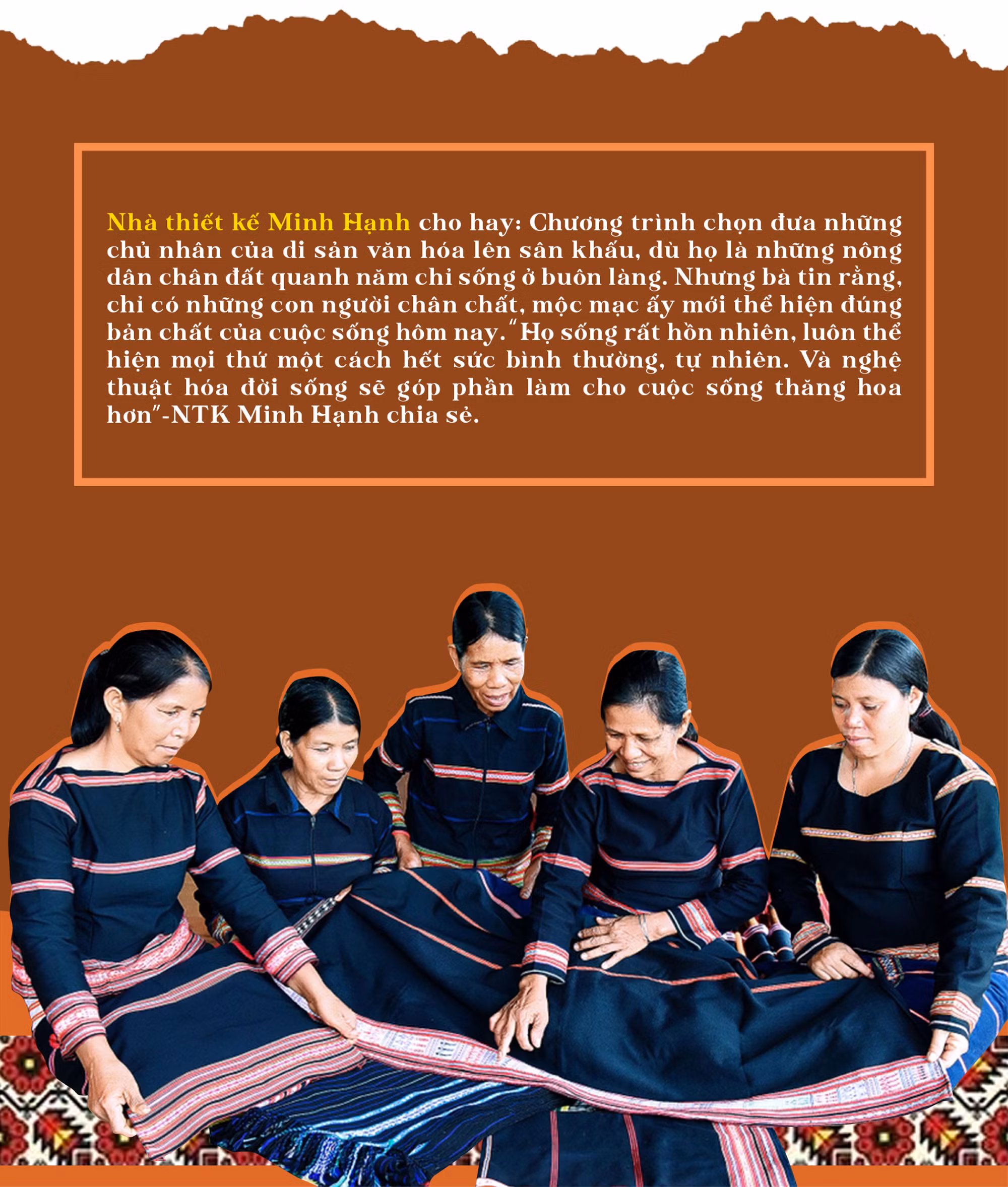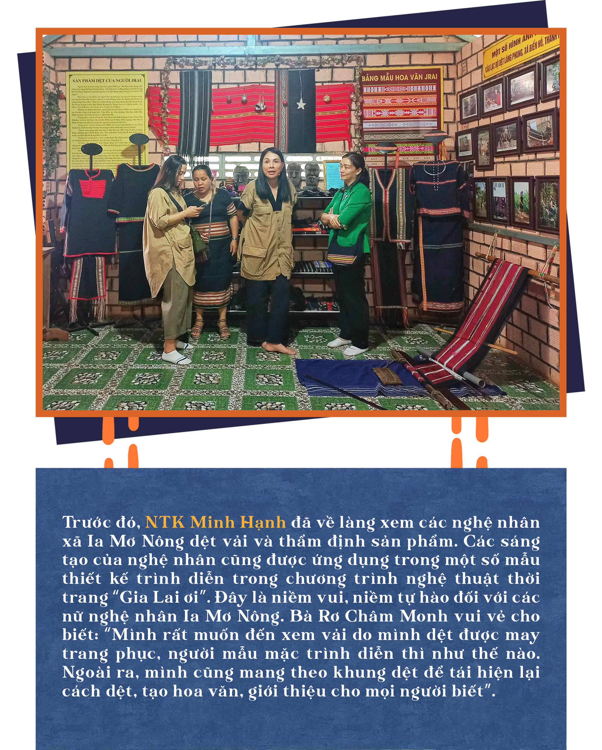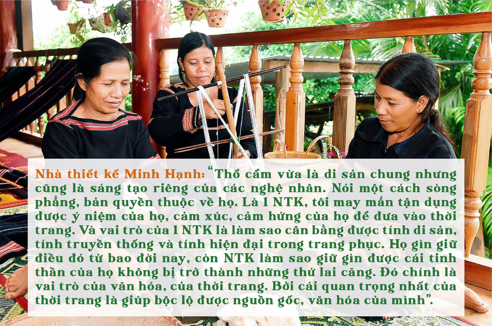 Tuy nhiên, Thạc sĩ Hoàng Thanh Hương cho rằng, kiến tạo giá trị mới cho thổ cẩm cũng trở thành áp lực với bà con khi nguyên liệu dệt truyền thống cũng như một số mẫu hoa văn đặc trưng được sáng tạo, gìn giữ bao đời đang đứng trước nguy cơ mai một trước dòng chảy của cuộc sống hiện đại. Và, với tiêu chuẩn rất cao của NTK Minh Hạnh, bà con đang dần phải thích nghi với yêu cầu và cách làm chuyên nghiệp để có cơ hội hợp tác lâu dài. “Tuy vậy, qua sự kiện lần này và hứa hẹn ở những sự kiện tương tự tiếp theo, các nữ nghệ nhân Bahnar, Jrai sẽ có cơ hội tiếp cận với nhiều hình thức để đưa thổ cẩm đến với cộng đồng nhiều hơn. Họ cũng nhận thức được sản phẩm của họ tạo nên là những sáng tạo vô cùng độc đáo, có giá trị cao và rất được yêu thích. Họ phải tự có ý thức giữ gìn, trao truyền, và cũng từ nghề này có thể khai thác được để phát triển kinh tế”.