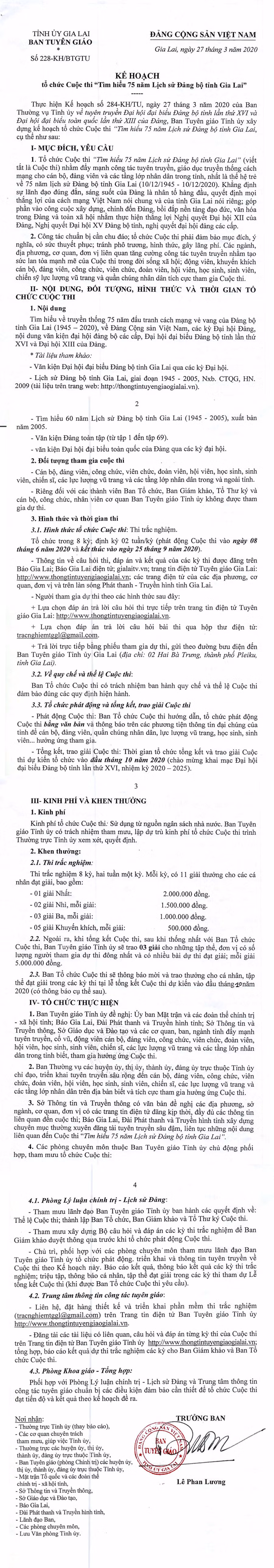 (GLO)- Thực hiện Kế hoạch số 284-KH/TU, ngày 27-3-2020 của Ban Thường vụ Tỉnh ủy về tuyên truyền Đại hội đại biểu Đảng bộ tỉnh lần thứ XVI và Đại hội đại biểu toàn quốc lần thứ XIII của Đảng, Ban Tuyên giáo Tỉnh ủy xây dựng kế hoạch tổ chức Cuộc thi "Tìm hiểu 75 năm Lịch sử Đảng bộ tỉnh Gia Lai".