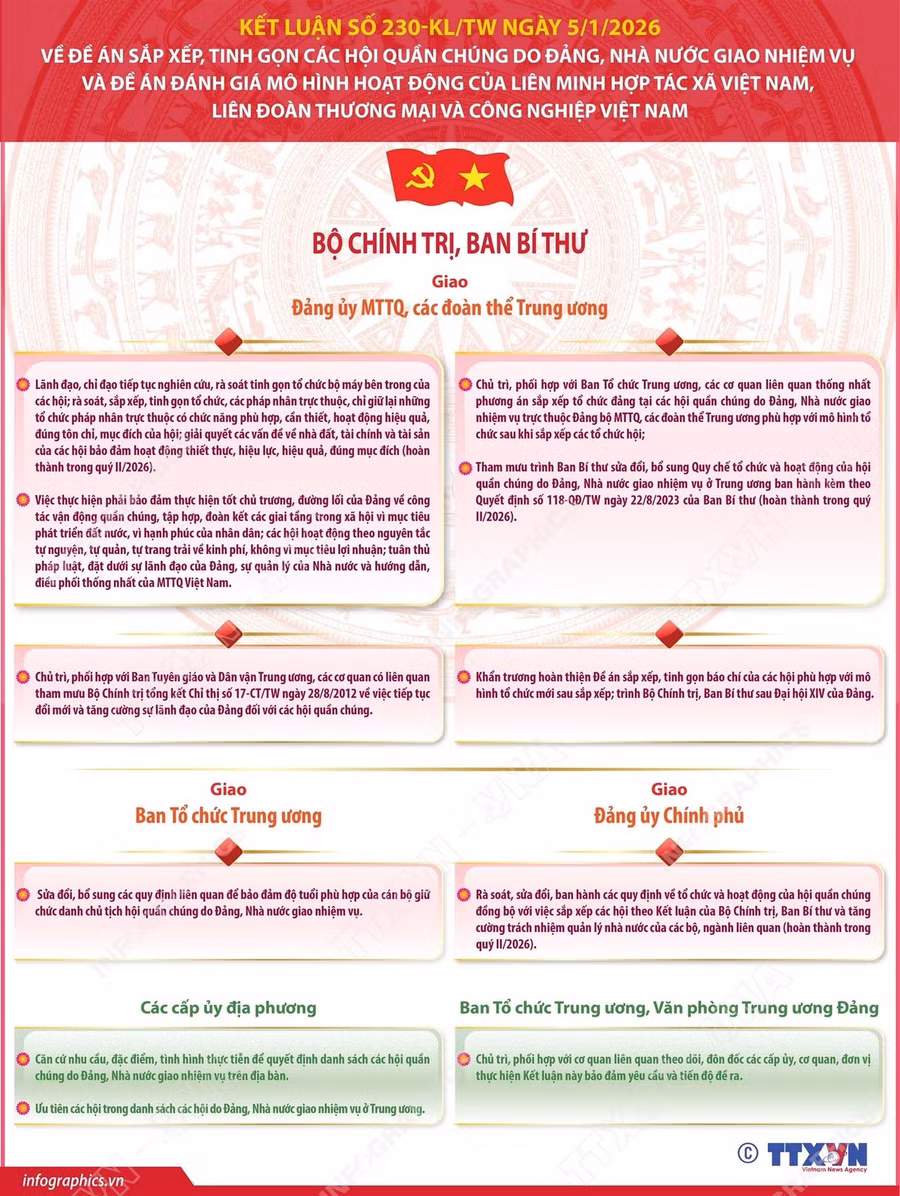 Bộ Chính trị, Ban Bí thư vừa ban hành Kết luận số 230-KL/TW, ngày 5/1/2026 về Đề án sắp xếp, tinh gọn các hội quần chúng do Đảng, Nhà nước giao nhiệm vụ và Đề án đánh giá mô hình hoạt động của Liên minh Hợp tác xã Việt Nam, Liên đoàn Thương mại và Công nghiệp Việt Nam.