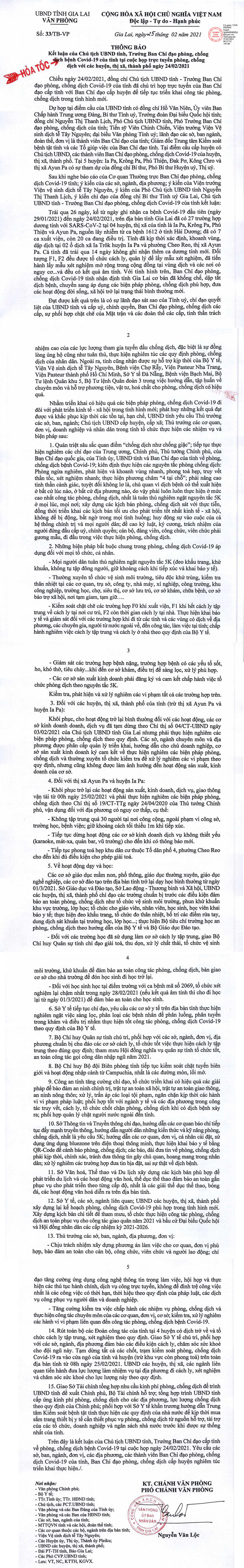 (GLO)- Ngày 25-2, Văn phòng UBND tỉnh Gia Lai có Thông báo số 33/TB-VP thông báo kết luận của Chủ tịch UBND tỉnh tại cuộc họp trực tuyến phòng-chống dịch bệnh Covid-19 với các huyện, thị xã, thành phố ngày 24-2-2021.