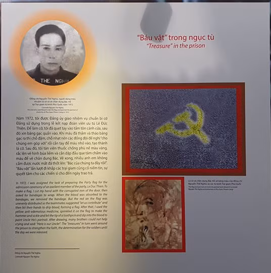 Lá cờ đảng và bức ảnh Bác Hồ do ông Nguyễn Thế Nghĩa dùng máu của mình để vẽ lên tại nhà tù Phú Quốc trước buổi kết nạp đảng viên trong tù. Trong lá cờ đảng còn thấm đẫm máu của ông Nghĩa và nhiều đồng đội cùng là tù binh tại nhà tù Phú Quốc.