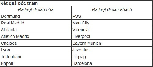 Chelsea chắc chắn sẽ cảm thấy “khó thở” khi đối thủ ở vòng 1/8 của họ sẽ là Bayern Munich, một trong những CLB giàu thành tích tại Champions League. Còn nhớ tại chung kết Champions League 2011/12, hai đội gặp nhau và Chelsea là những người nở cụ cười chiến thắng. Juventus của Cristiano Ronaldo thì lại có thể thở phào khi chỉ phải gặp Lyon. Một cặp đấu đáng chú ý khác là cuộc đụng độ giữa PSG và Dortmund. HLV Thomas Tuchel của PSG từng có thời gian rất thành công khi dẫn dắt Dortmund. Cặp đấu còn lại là cuộc đối đầu giữa Valencia và Atalanta.