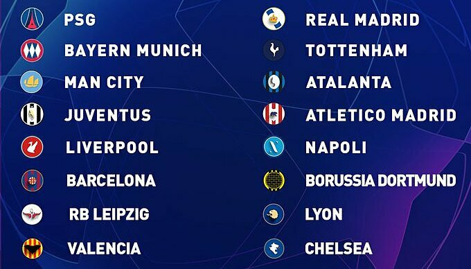 Vòng bảng Champions League 2019-2020 kết thúc hôm 11/12, với tám đội dẫn đầu mỗi bảng gồm: Barcelona, Bayern Munich, Juventus, Leipzig, Liverpool, Man City, PSG và Valencia. Tám đội nhì bảng cũng vào vòng 1/8 là: Atalanta, Borussia Dortmund, Chelsea, Lyon, Napoli, Real Madrid, Atletico Madrid và Tottenham.