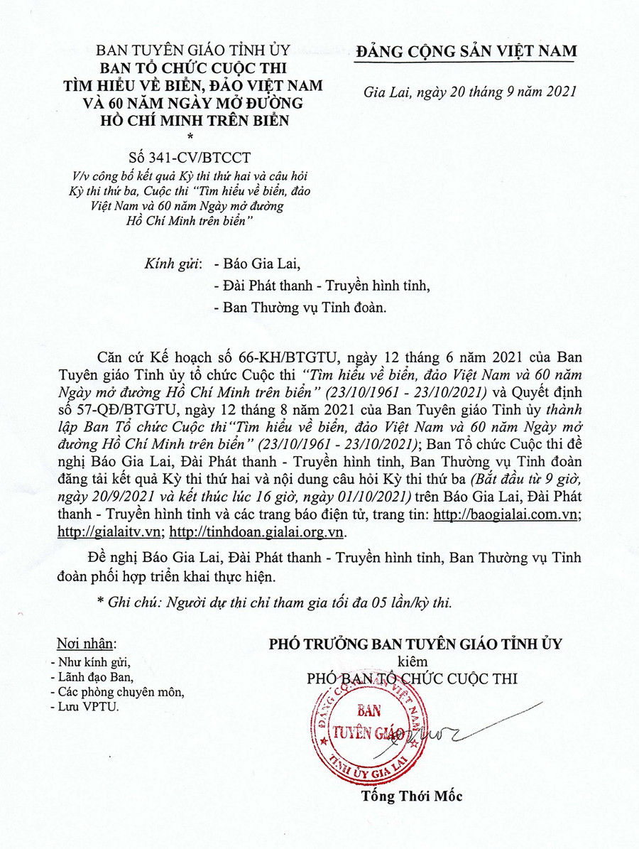 Kỳ thi thứ hai Cuộc thi “Tìm hiểu về biển, đảo Việt Nam và 60 năm Ngày mở đường Hồ Chí Minh trên biển” (23/10/1961 - 23/10/2021) do Ban Tuyên giáo Tỉnh ủy Gia Lai tổ chức đã thu hút 255.779 lượt người thuộc 41 tỉnh, thành phố tham gia dự thi. Ban tổ chức Cuộc thi công bố kết quả như sau: