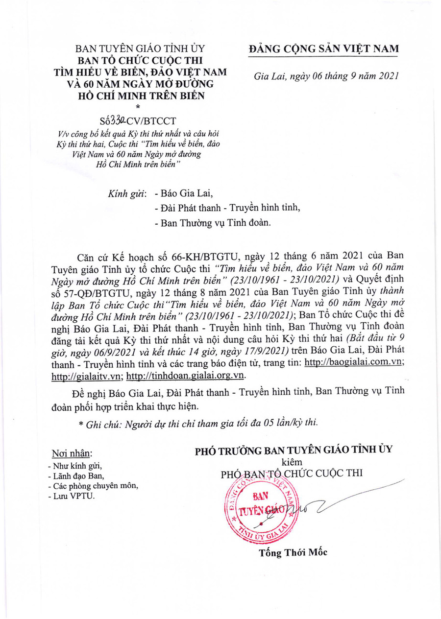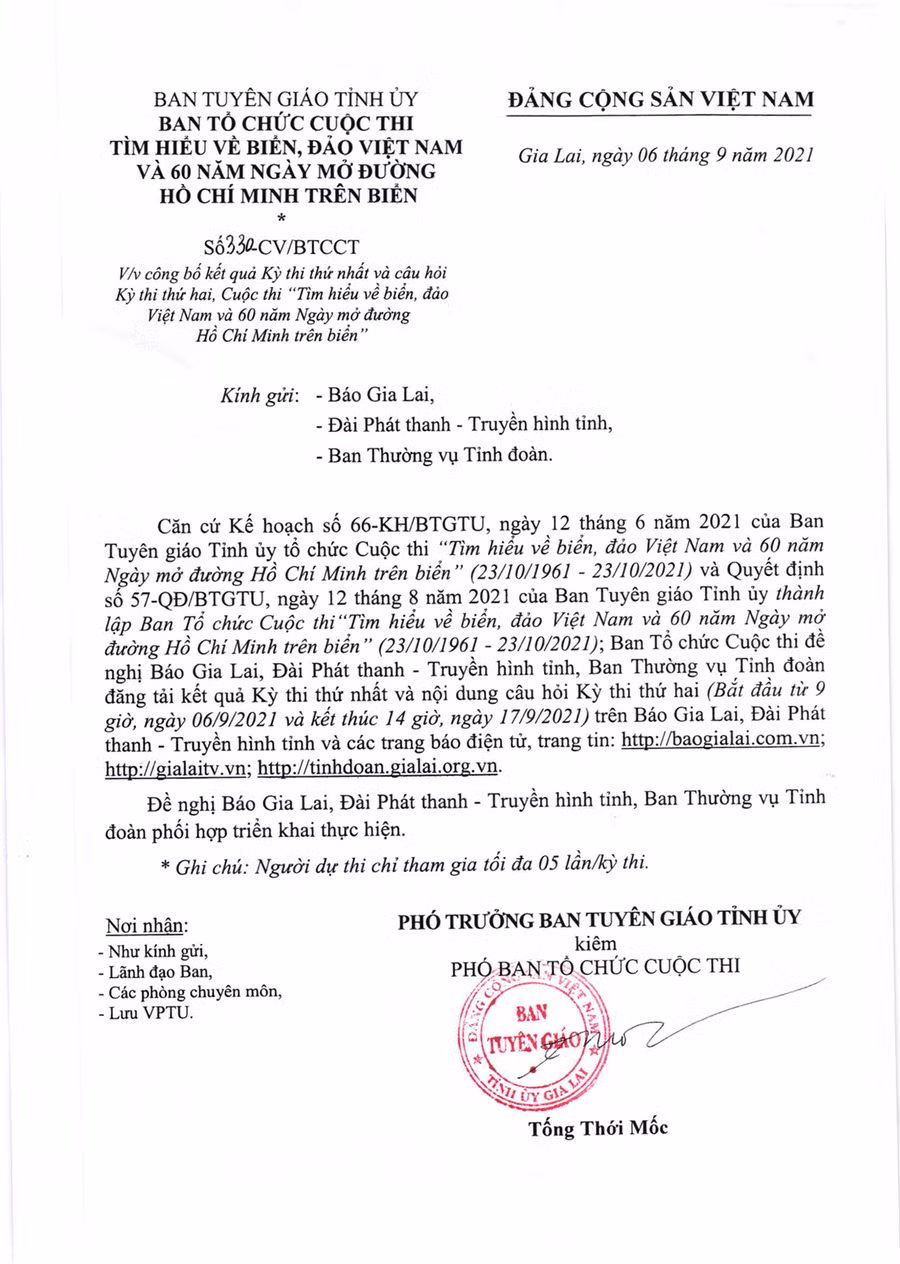 (GLO)- Ngày 6-9, Ban Tuyên giáo Tỉnh ủy Gia Lai có Công văn số 330-CV/BTCCT về công bố kết quả Kỳ thi thứ nhất và câu hỏi Kỳ thi thứ hai Cuộc thi "Tìm hiểu về biển, đảo Việt Nam và 60 năm Ngày mở đường Hồ Chí Minh trên biển".