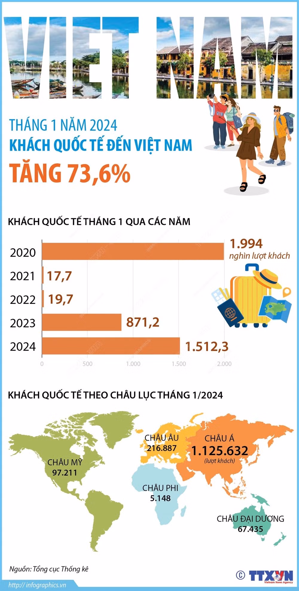 Về quy mô thị trường, Hàn Quốc tiếp tục là thị trường gửi khách đến lớn nhất trong tháng 1 với 418.000 lượt (chiếm 27,6%); Trung Quốc (xếp thứ 2) với 242.000 lượt, Đài Loan (thứ 3) với 84.000 lượt, Mỹ (thứ 4) với 76.000 lượt.