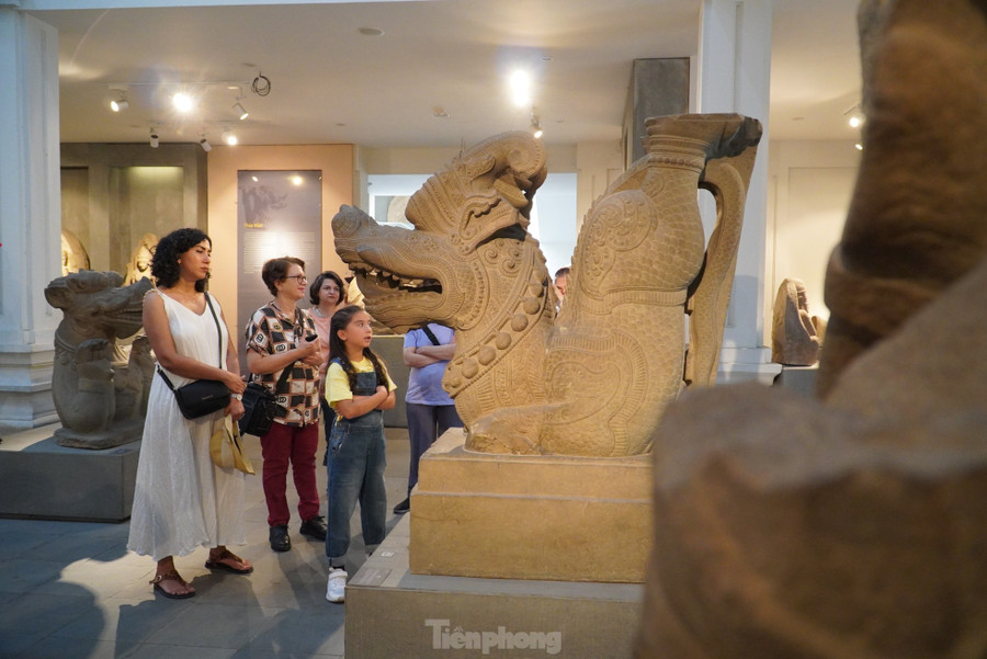| Du khách vây quanh tượng thần Ganesha (thế kỷ VII), xuất xứ Mỹ Sơn, Quảng Nam, chất liệu sa thạch. Tượng được phát hiện vào năm 1903 khi Viện Viễn Đông Bác Cổ Pháp (EFEO) tiến hành khảo cổ tại di tích Mỹ Sơn, và được đưa về lưu giữ tại bảo tàng từ năm 1918. Đây là một trong những tượng tròn hiếm hoi thể hiện vị thần ở dạng thức đứng, còn tương đối nguyên vẹn. Hiện vật được công nhận là Bảo vật quốc gia vào năm 2020. Ảnh: Thanh Hiền. |