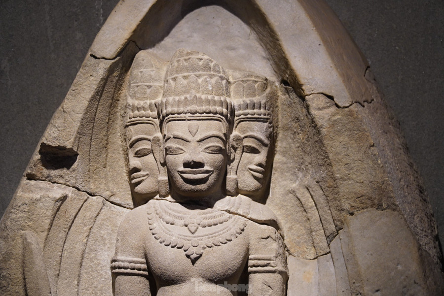 | Apsara (thế kỷ X) xuất xứ Trà Kiệu, Quảng Nam, chất liệu sa thạch. Apsara là nàng tiên trong thần thoại Ấn Độ. Một góc đài thờ hiện đang trưng bày được điêu khắc nổi hai vũ nữ Apsara cùng hai nhạc công Gandharva đang chơi đàn. Ảnh: Thanh Hiền. |