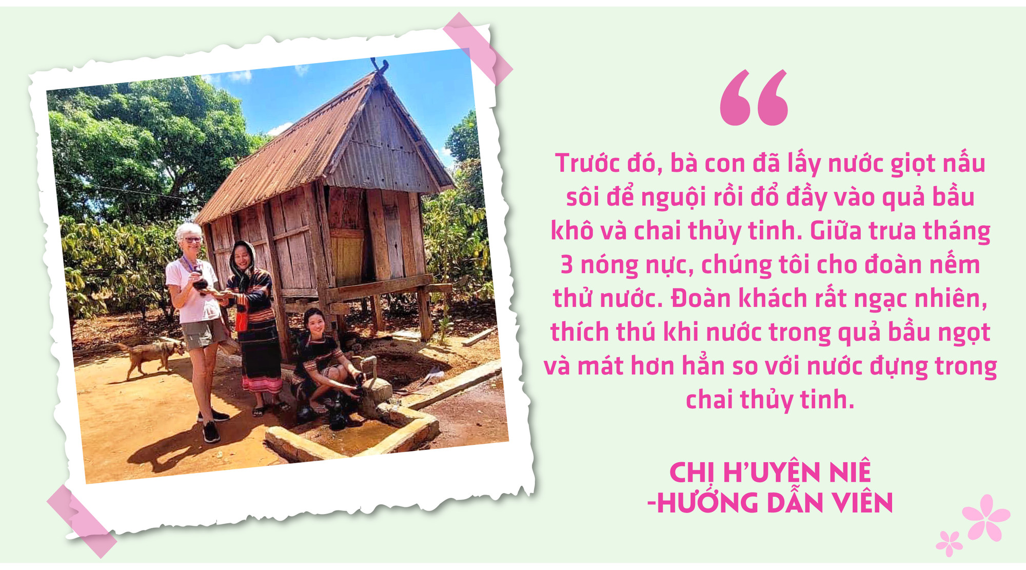 Chị H’Uyên Niê-Hướng dẫn viên-cho biết: Du khách được tham quan giọt nước, khu nhà mồ của làng Kép 2, quy trình làm quả bầu đen, thưởng thức món truyền thống của người Tây Nguyên. Sau khi được uống nước đựng trong quả bầu, nhiều vị khách Đan Mạch tấm tắc khen. Một số du khách thích thú với quả bầu khô đựng nước.